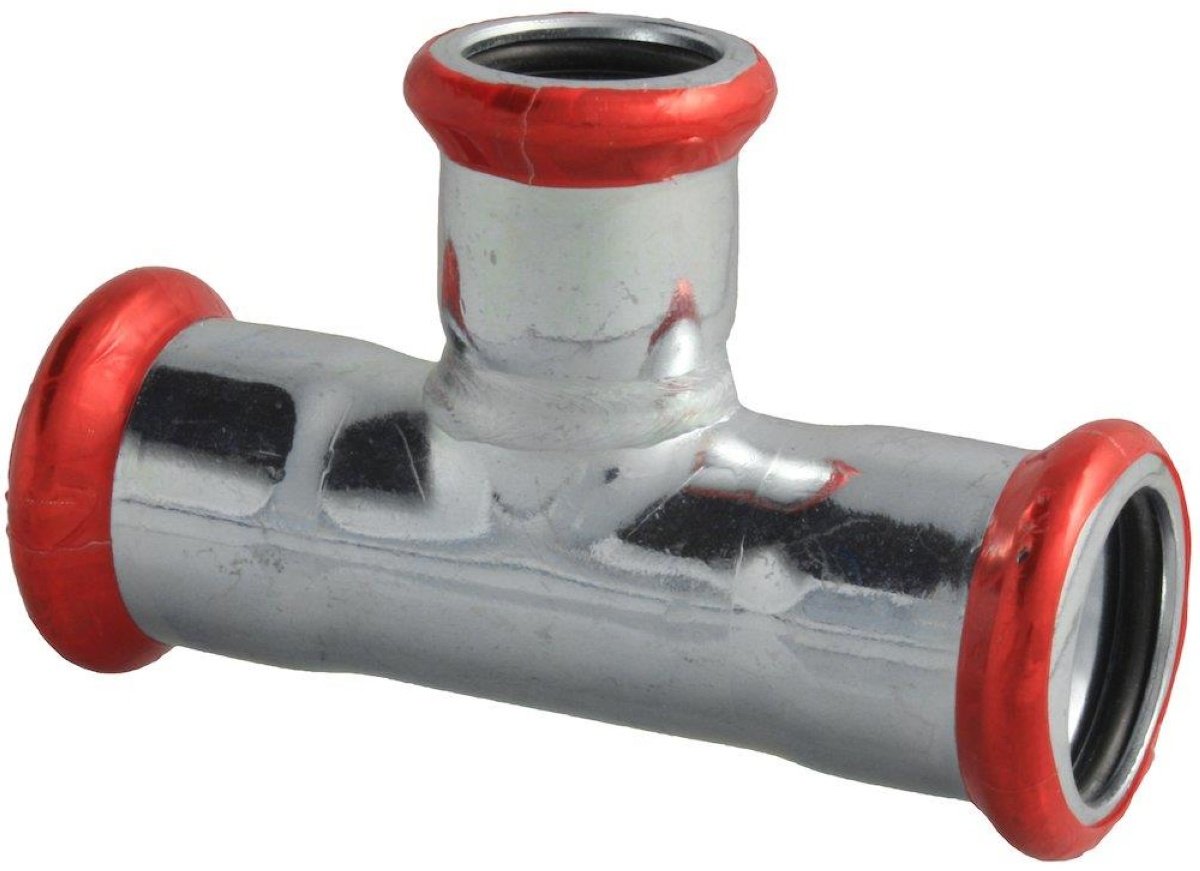 Unico forzinket T-stykke med reduceret afgrening og presmuffer. Anvendes til bl.a varme,- køl,- og industrianlæg. Når en samling er presset korrekt forsvinder den røde fil...