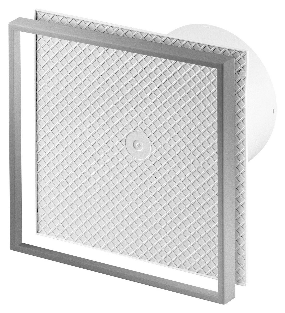 Frontpanel til System+ ventilator ø100, designet til flisemontering (161x161 mm flise). Kan kombineres med ventilatorhus eller ramme med insektnet.