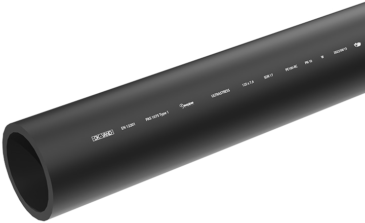 Evopipes PE100RC trykrør er kendetegnet ved høj fleksibilitet, trækstyrke og korrosionsbestandighed. Røret opfylder alle markedets krav og er certificeret og mærket med Nordic Poly Mark samt opfylder kravene i EN12201.