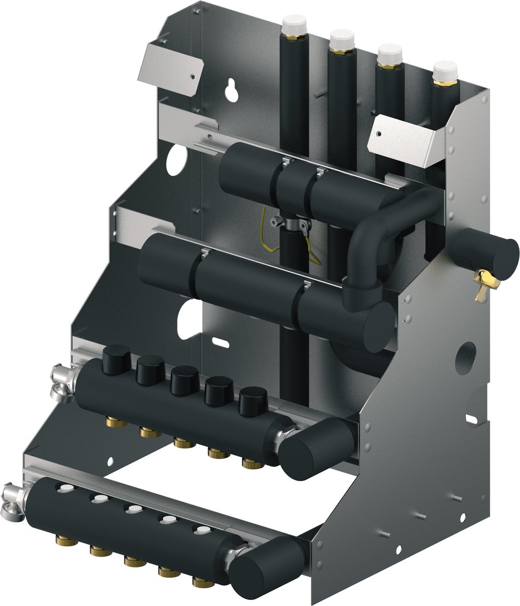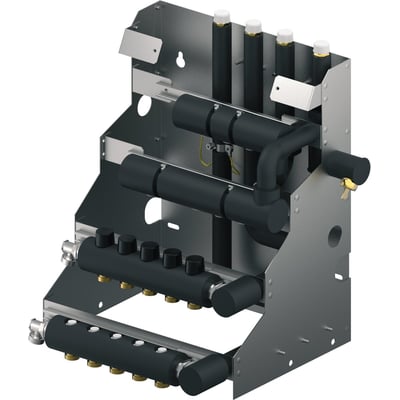 Bundmodul til anvendelse i kombination med Uponor Combi Port INS fjernvarmeunits. Bundmodulet samler rørføringen i én enhed i kombination med den varmeproducerende enhed i boligen. Dette sikrer en kompakt installation, som typisk kan installeres i et skab eller en skakt.