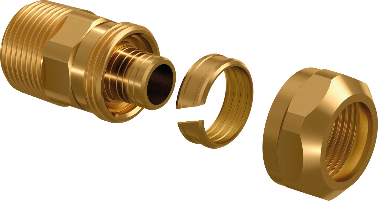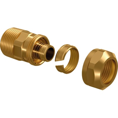 Uponor Ecoflex kompressionskobling PN10. 3/4" nippel til Uponor PE-Xa rør. Fremstillet af afzinkningsbestandig messing. Max 10 bar.