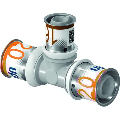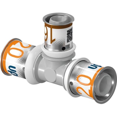Reduceret tee af PPSU med presskappe af rustfrit stål/aluminium. Til brugsvands- og radiatorsystemer. Anvendes med Uponor MLC-rør og godkendt presværktøj.