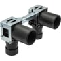 Dobbelt koblingsdåse med Q&E vinkler i afzinkningsfri messing, hvide Q&E ringe, monteringsbeslag i metal til c/c 150 mm og skruer. Til vandtæt samling med PE-Xa rør.