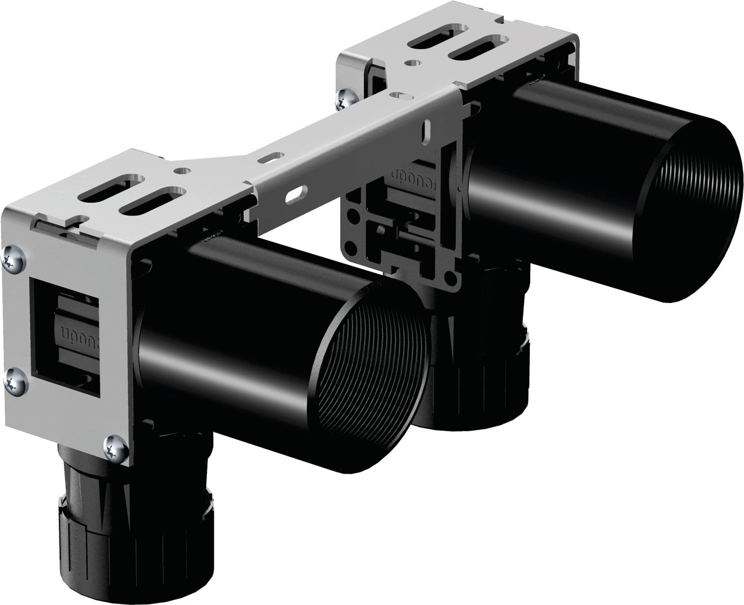 Denne dobbelte koblingsdåse M7a fra Uponor er designet med Q&E vinkler i afzinkningsfri messing og leveres med hvide Q&E ringe samt monteringsbeslag i metal til montering c/c 150 mm og de nødvendige monteringsskruer.