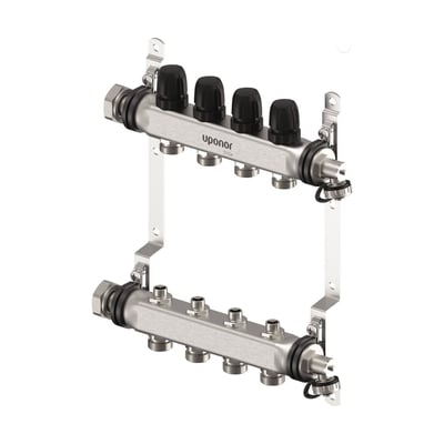 Komplet Uponor Vario S fordelerrørsæt i rustfri stål til gulvvarme med 4 kredse og 3/4" Eurokonus. Leveres med bæringer, 1" tilgangsstykker og aftap/påfyldventiler.