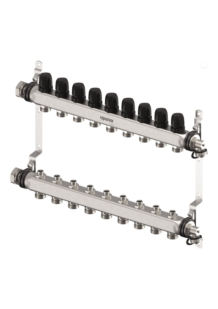 Faste fordelerørssæt c/c 50 mm for gulvvarme i rustfrit stål med 3/4 Eurokonus. Leveres komplet med: