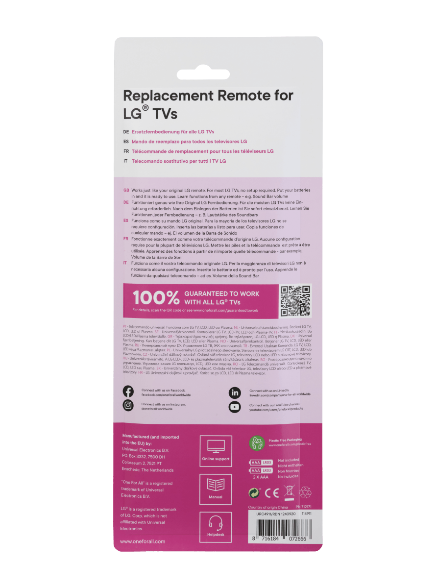 Denne URC 4911 erstatningsfjernbetjening er designet til at fungere problemfrit med alle LG TV-modeller. Den tilbyder 100 % kompatibilitet og kræver ingen opsætning for langt de fleste LG-fjernsyn, hvilket sikrer en øjeblikkelig og brugervenlig oplevelse.