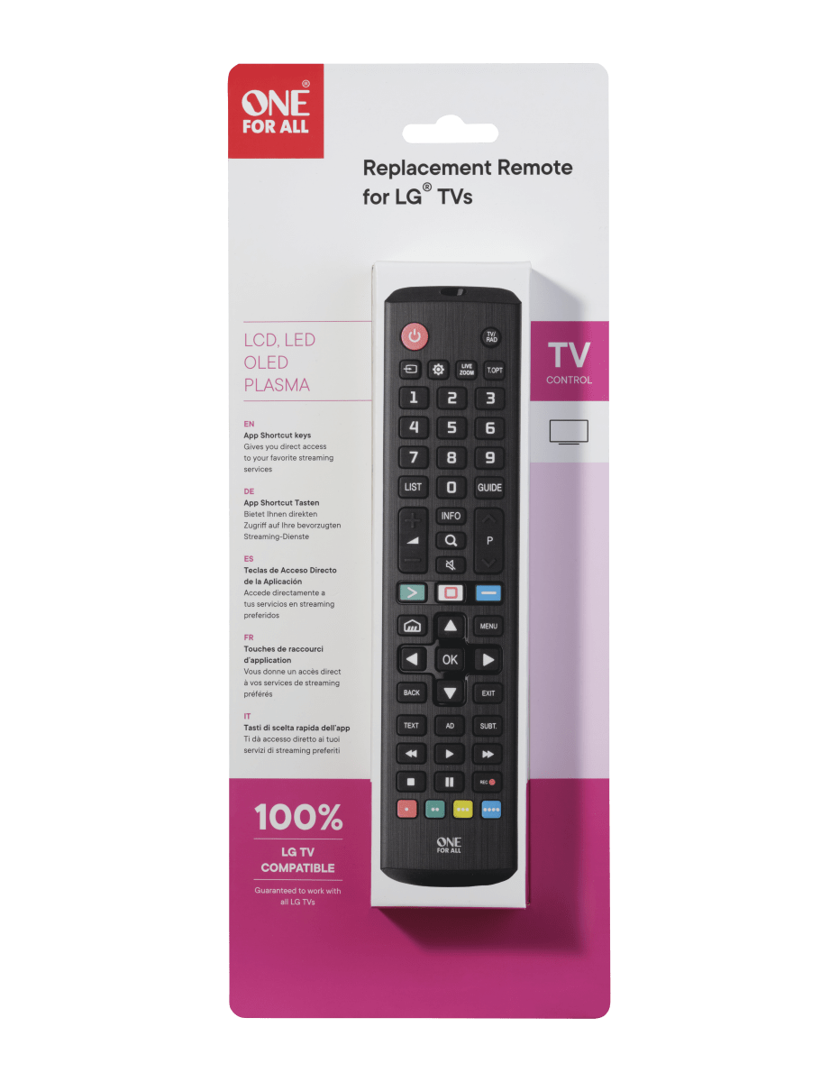 Den perfekte erstatningsfjernbetjening til dit LG TV. Garanteret 100 % kompatibilitet med alle LG TV-modeller og kræver ingen opsætning for de fleste LG-fjernsyn.