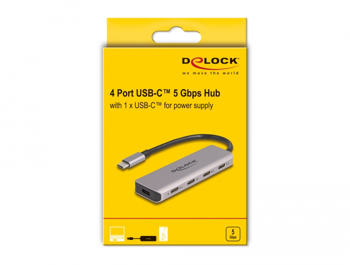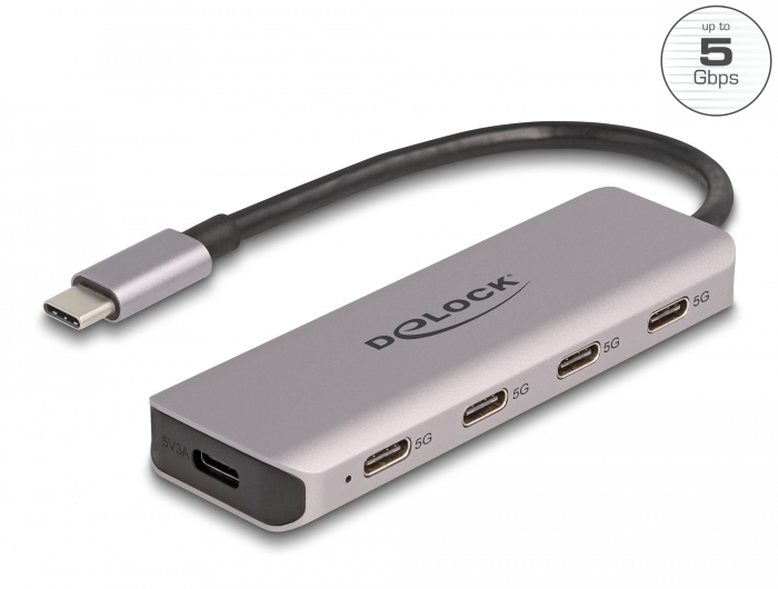 Solid USB hub fra Delock med metalhus. Tilsluttes via USB Type-C™ og udvider computeren med 4 USB-C™ porte.