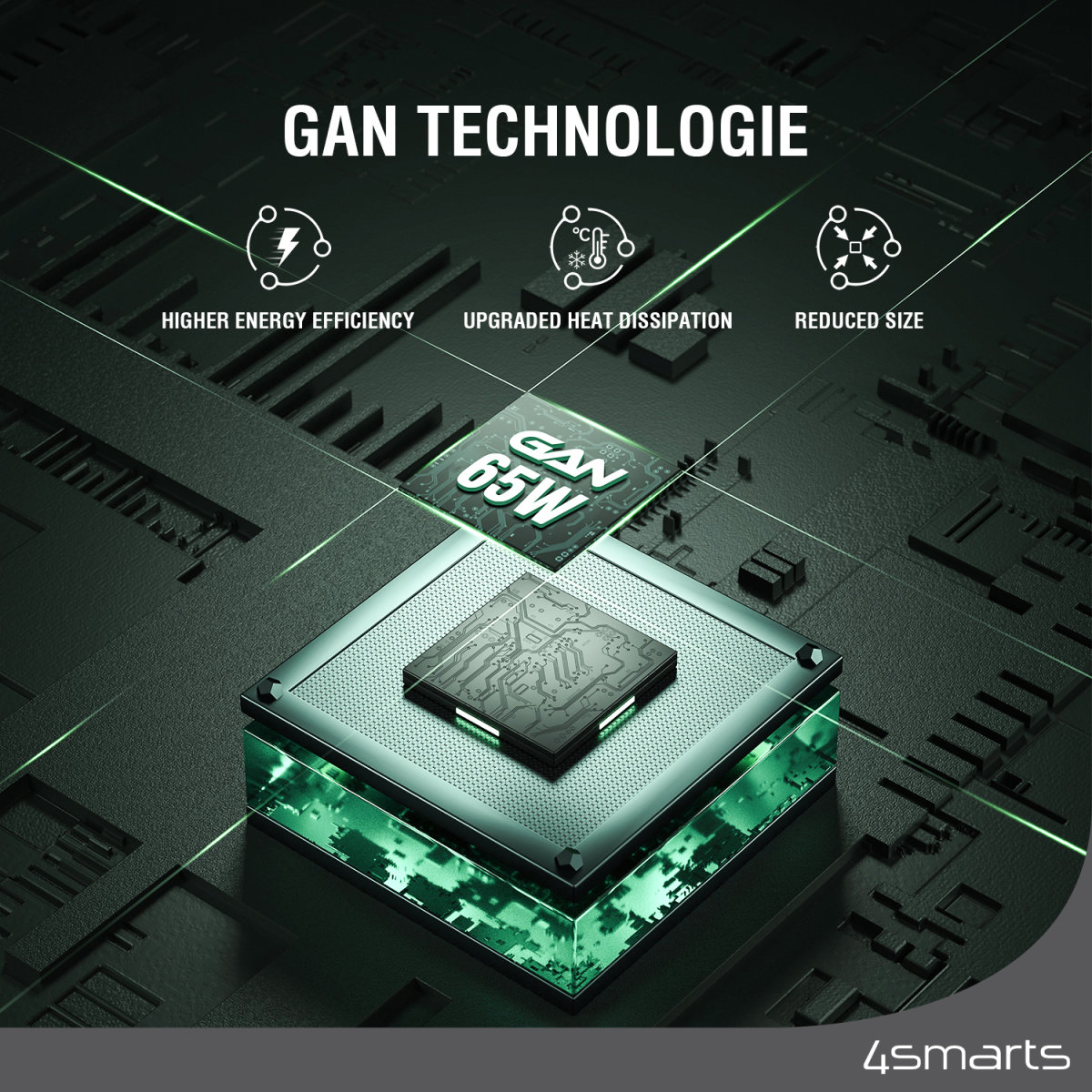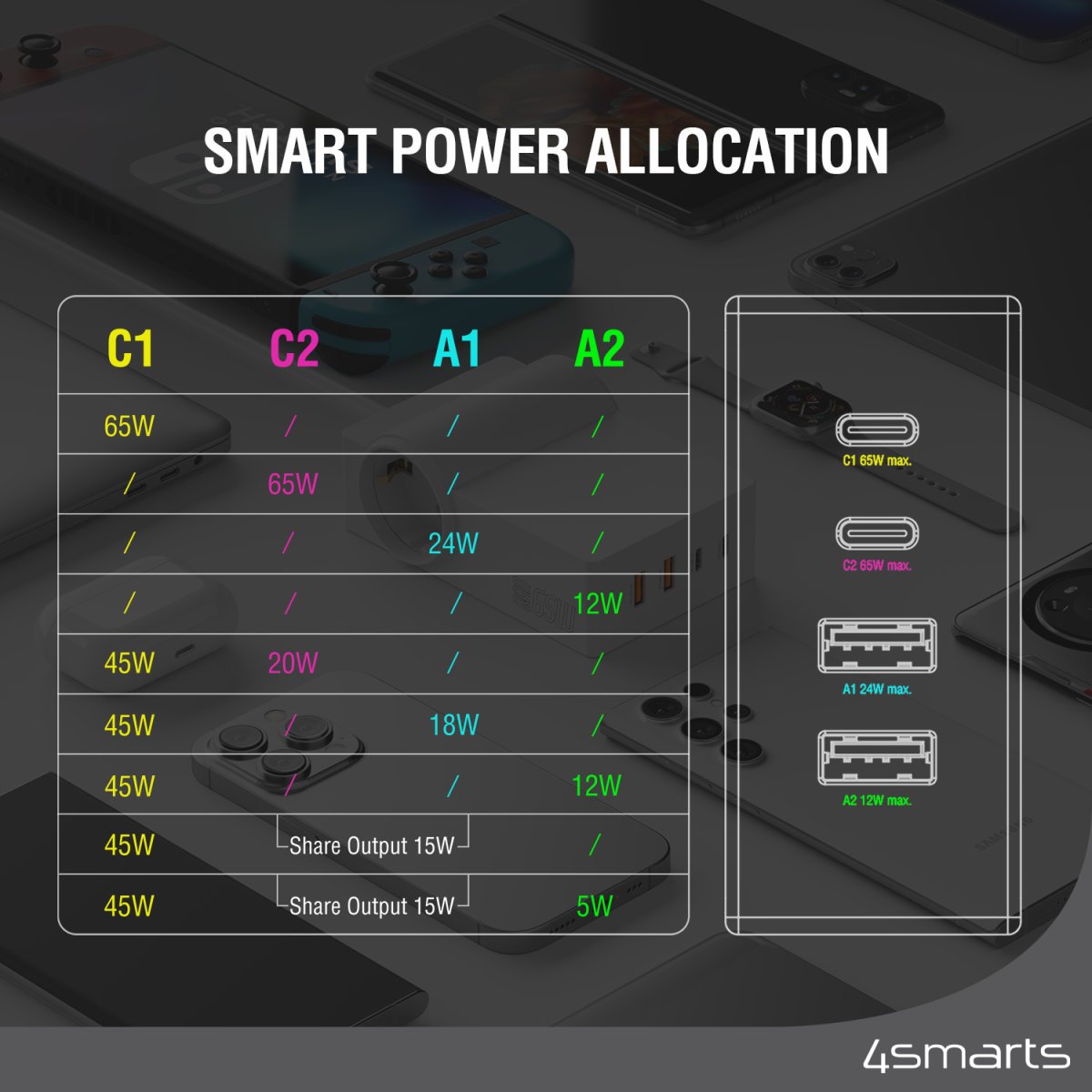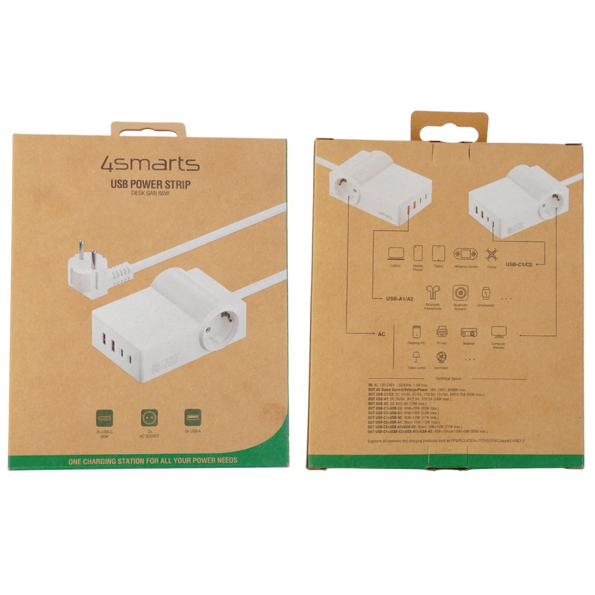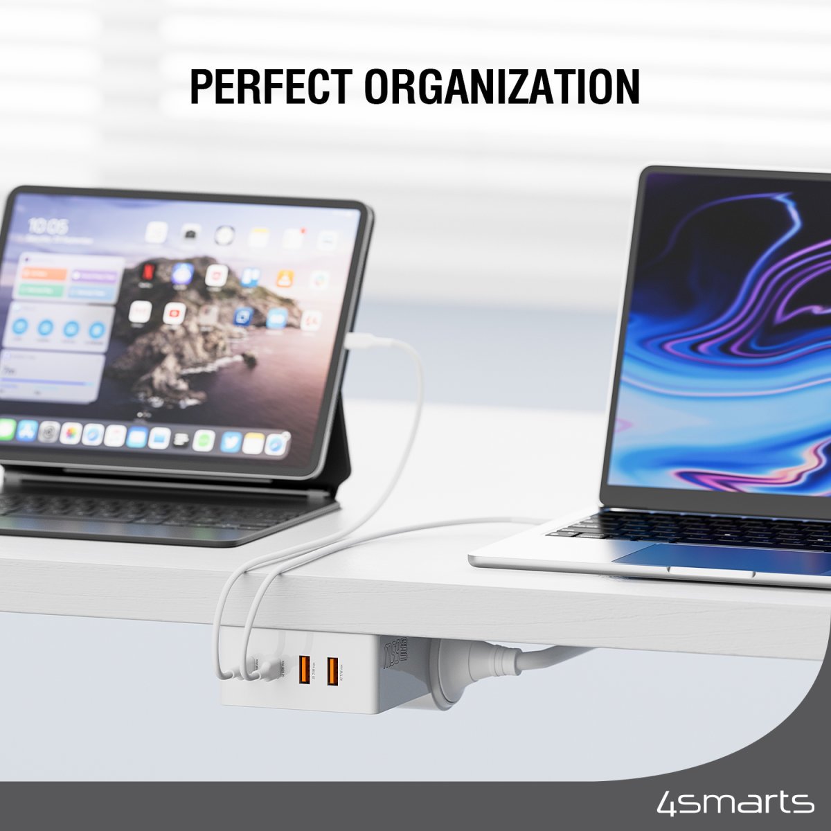 Med den medfølgende holder sparer du plads og holder orden. Strømskinnen har en maksimal effekt på 65W og understøtter hurtig opladning takket være GaN-teknologi, hvilket sikrer en kompakt formfaktor.