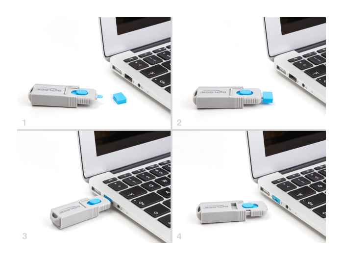 Adgang via kabler eller USB-stik til porten er derefter ikke længere mulig. For at åbne låsen kræves det medfølgende værktøj.
