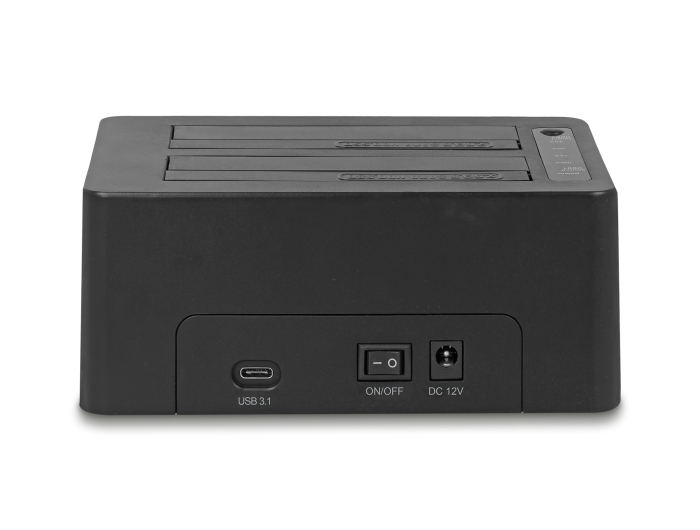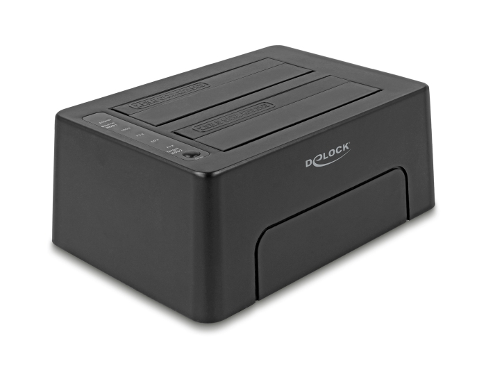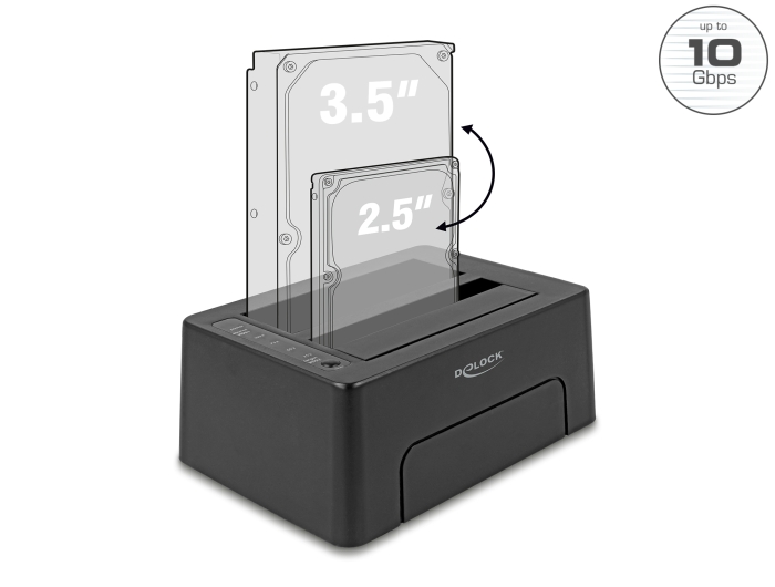Denne dockingstation fra Delock muliggør ekstern tilslutning af op til to 2.5" eller 3.5" SATA HDD'er eller SSD'er via USB-C™-interfacet. Denne løsning kræver ikke et eksternt kabinet, da drevet kan tilsluttes direkte til dockingstationen.