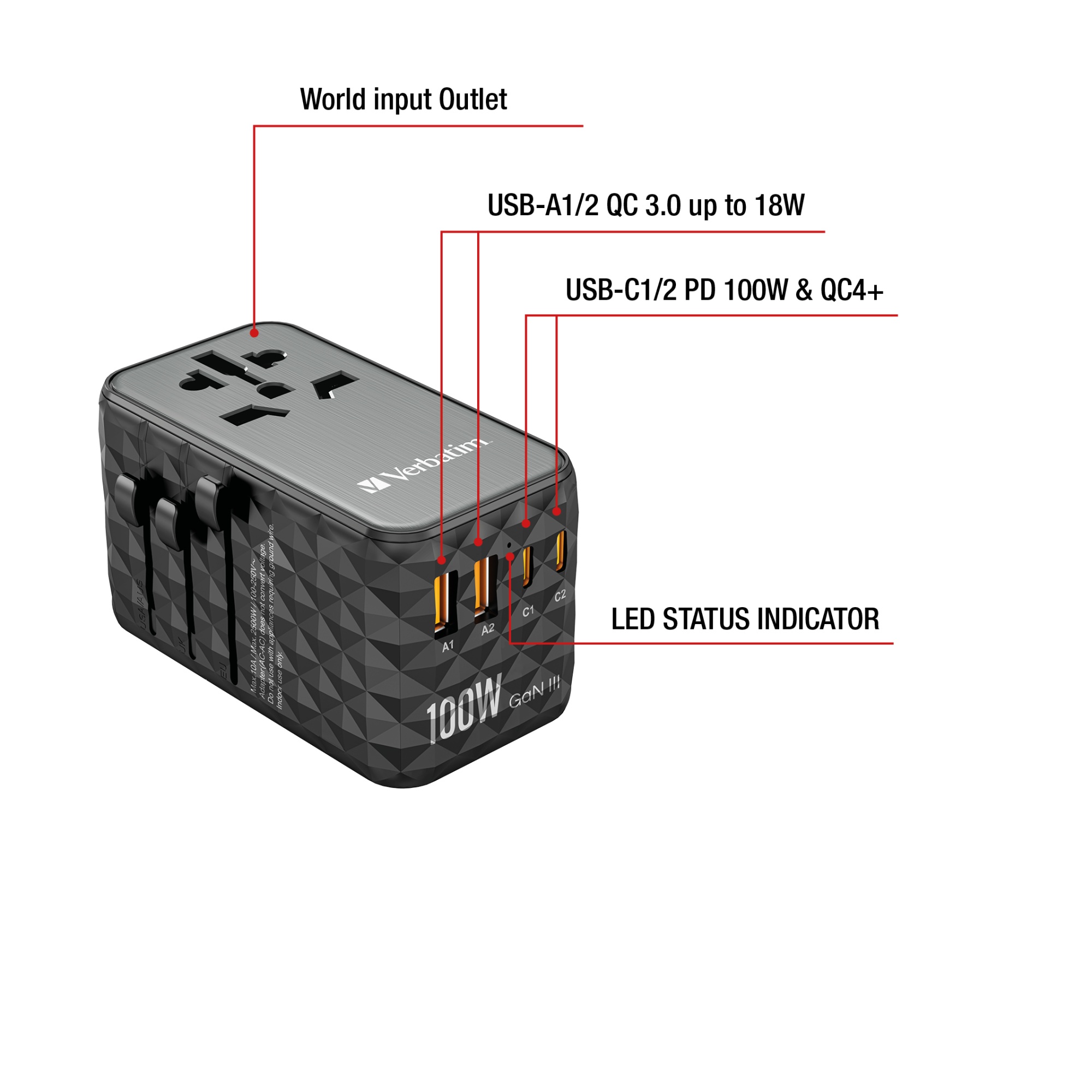 Denne universal rejseadapter fra Verbatim er udstyret med GaN III teknologi, hvilket sikrer en effektiv og hurtig opladning af dine enheder. Med 2 x USB-C PD porte kan du oplade flere enheder samtidigt, hvilket gør den ideel til rejsen.