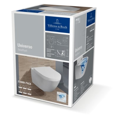 V&B 4670 Universo Twistflush kombipakke med vægskål inkl. Duroplast sæde C+. Væghængt model uden skyllekant, TwistFlush, soft close og QuickRelease. Skyllevolumen: 3/4,5 l. Farve: Hvid Alpin.