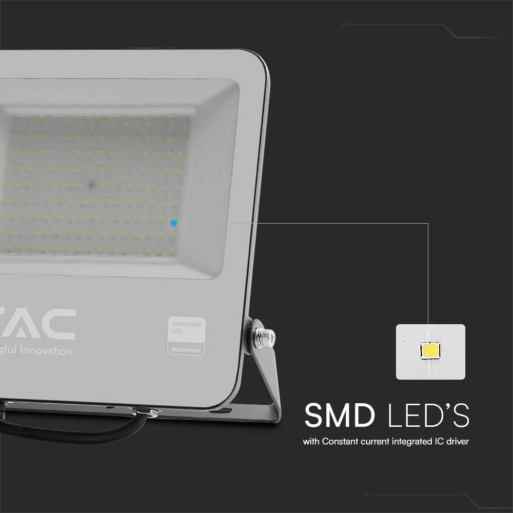 Kraftig 200W LED projektør fra V-Tac med Samsung LED chip, der leverer 22960lm ved 6500K. Den er IP65-klassificeret og ideel til udendørs brug.