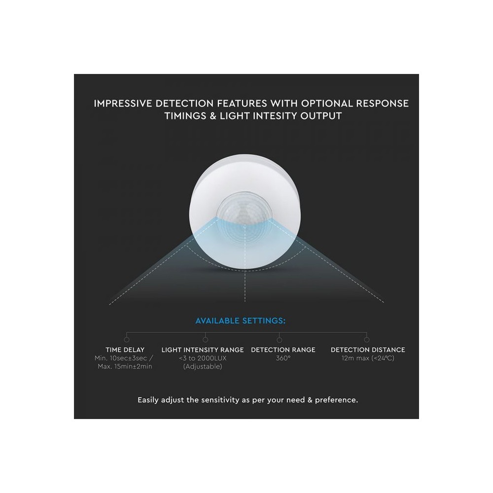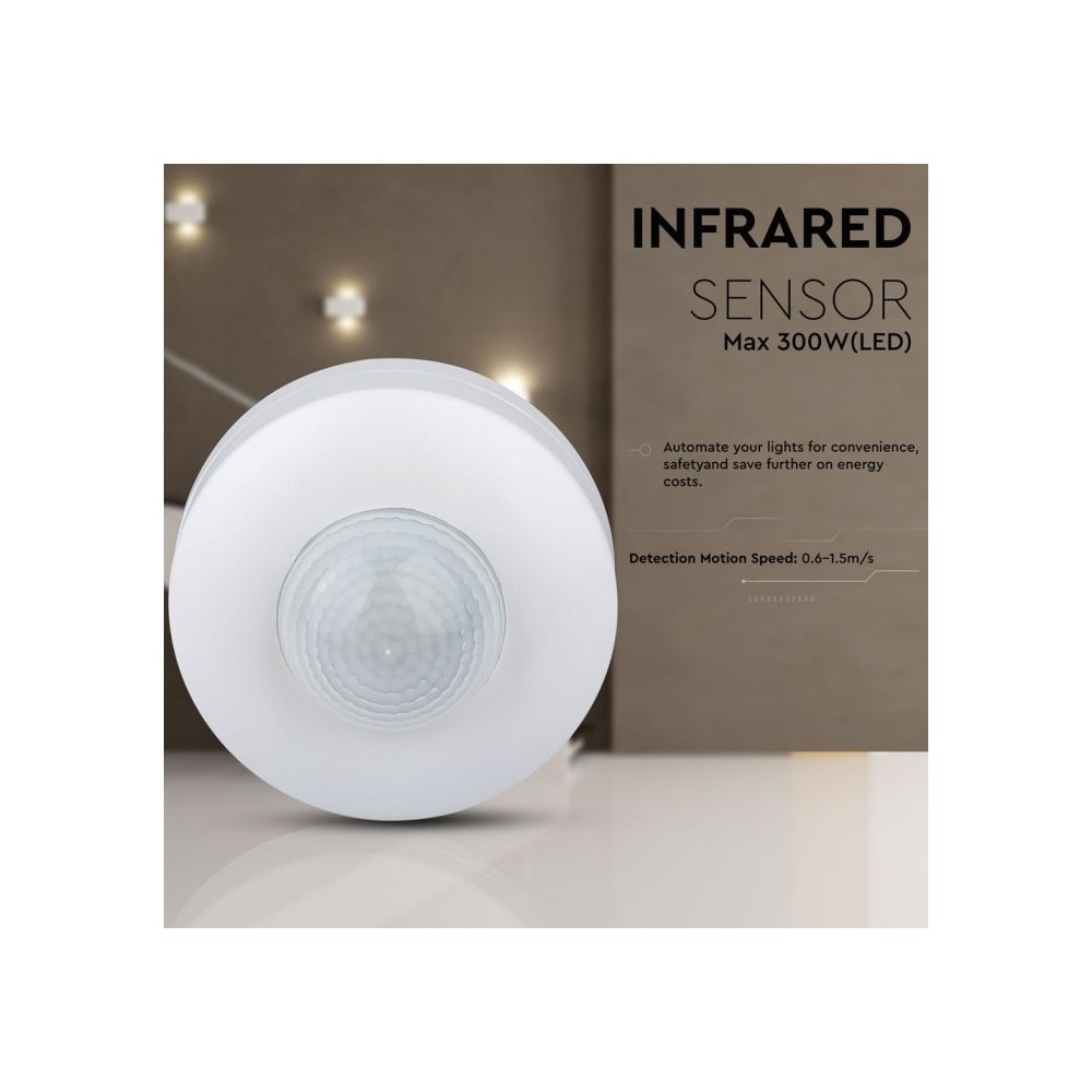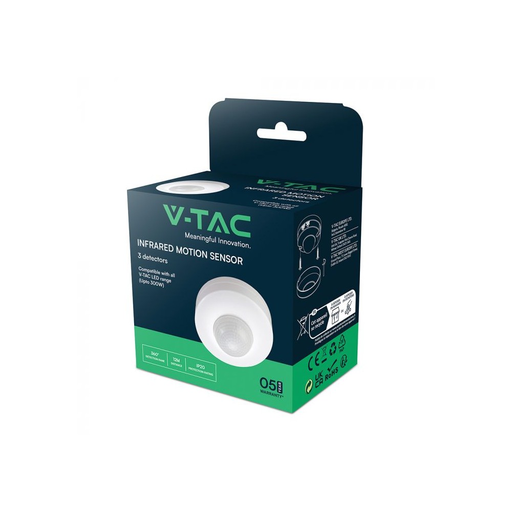 Effektiv V-Tac bevægelsessensor i hvid PVC. PIR infrarød teknologi, LED venlig og ikke dæmpbar. Ideel til automatisk lysstyring.