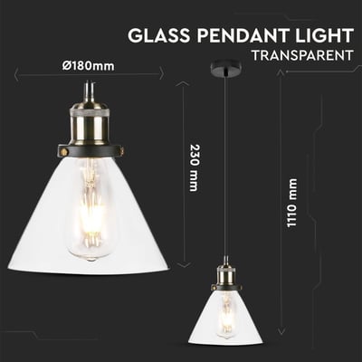 Denne moderne pendellampe fra V-Tac er et stilfuldt og elegant valg til enhver indretning. Lampen er udført i gennemsigtigt glas, der sikrer et flot og blødt lys. Med en diameter på 18 cm er den velegnet til mindre rum eller som en del af et større lysarrangement.