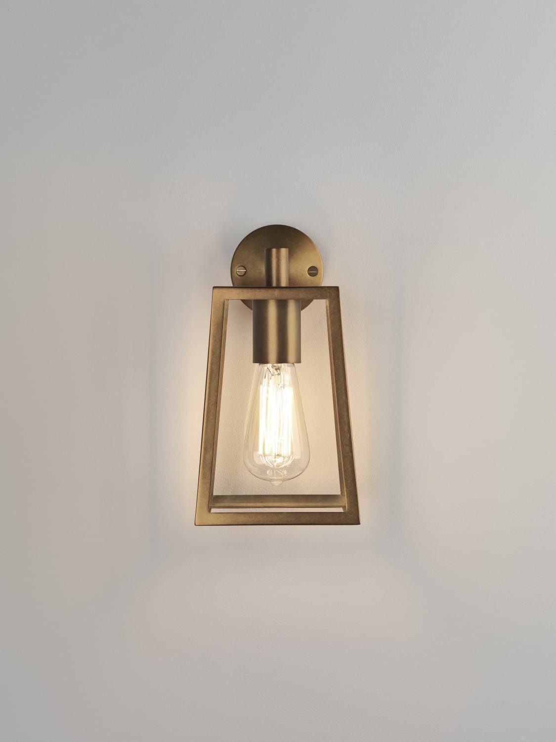 Klassisk udendørs væglampe fra Astro. Model 7984 Calvi Wall 215 med IP23-klassificering. Fremstillet i antik messinglakeret rustfrit stål med klart glas. Til 230V E27 LED, max 12W. Dimensioner: H280 x B150 x D200mm.