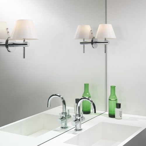 Denne elegante væglampe fra Astro, model 0343 Roma, er udført i blank krom og har en opal glasskærm. Lampen er IP44-godkendt, hvilket gør den velegnet til brug i vådrum.