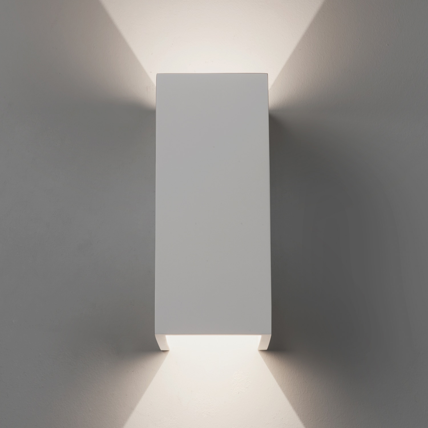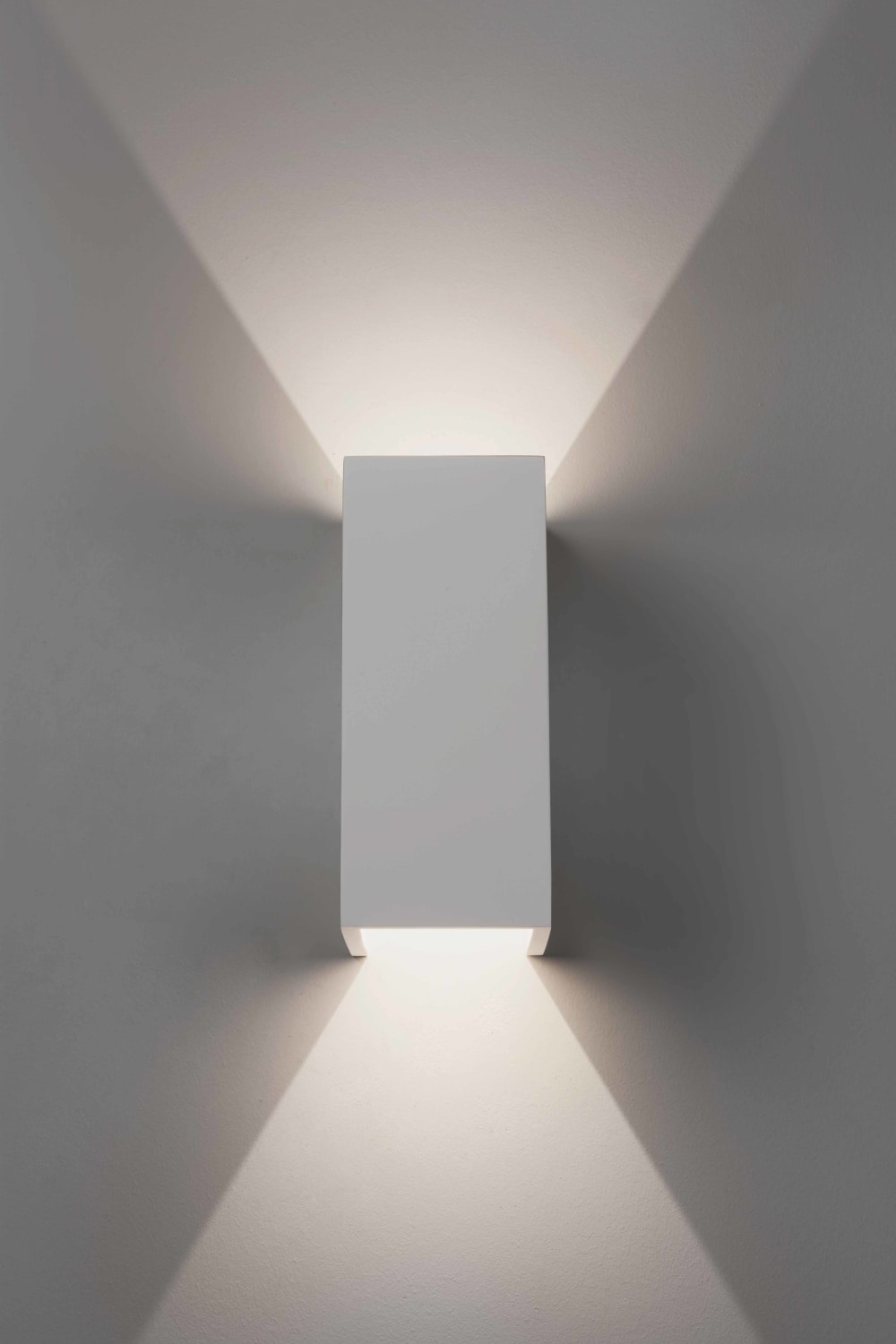 Astro Parma 210 er et dekorativt vægarmatur i hvid gips med op- og nedlys. Det anvender 2 x GU10 lyskilder (maks. 50W) og kan males i ønsket farve. Lyskilder medfølger ikke.