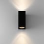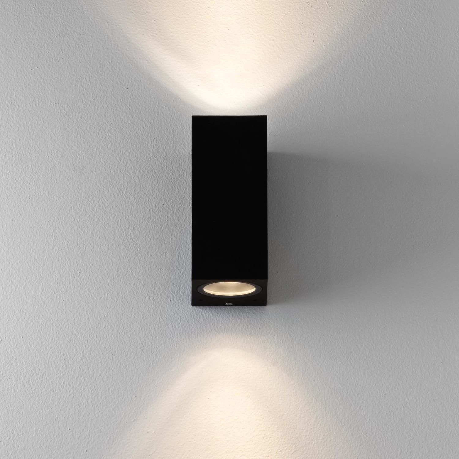 Elegant Astro Chios 150 SPA vægarmatur i sort aluminium til udendørs og indendørs brug. Bruger 2 x GU10 LED pærer (maks. 6W pr. pære). IP44-godkendt.