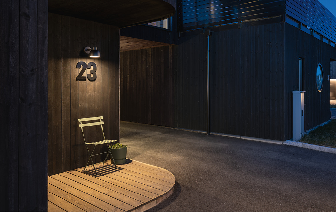 Montering er enkel takket være det medfølgende vægbeslag og Quick connector. Lampen er udstyret med flere kabelindgange på bagsiden og brudåbninger til overflademonteret kabel, hvilket letter installationen. Med en IP65-klassificering er lampen beskyttet mod støv og vandstråler, hvilket gør den ideel til udendørs brug.