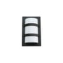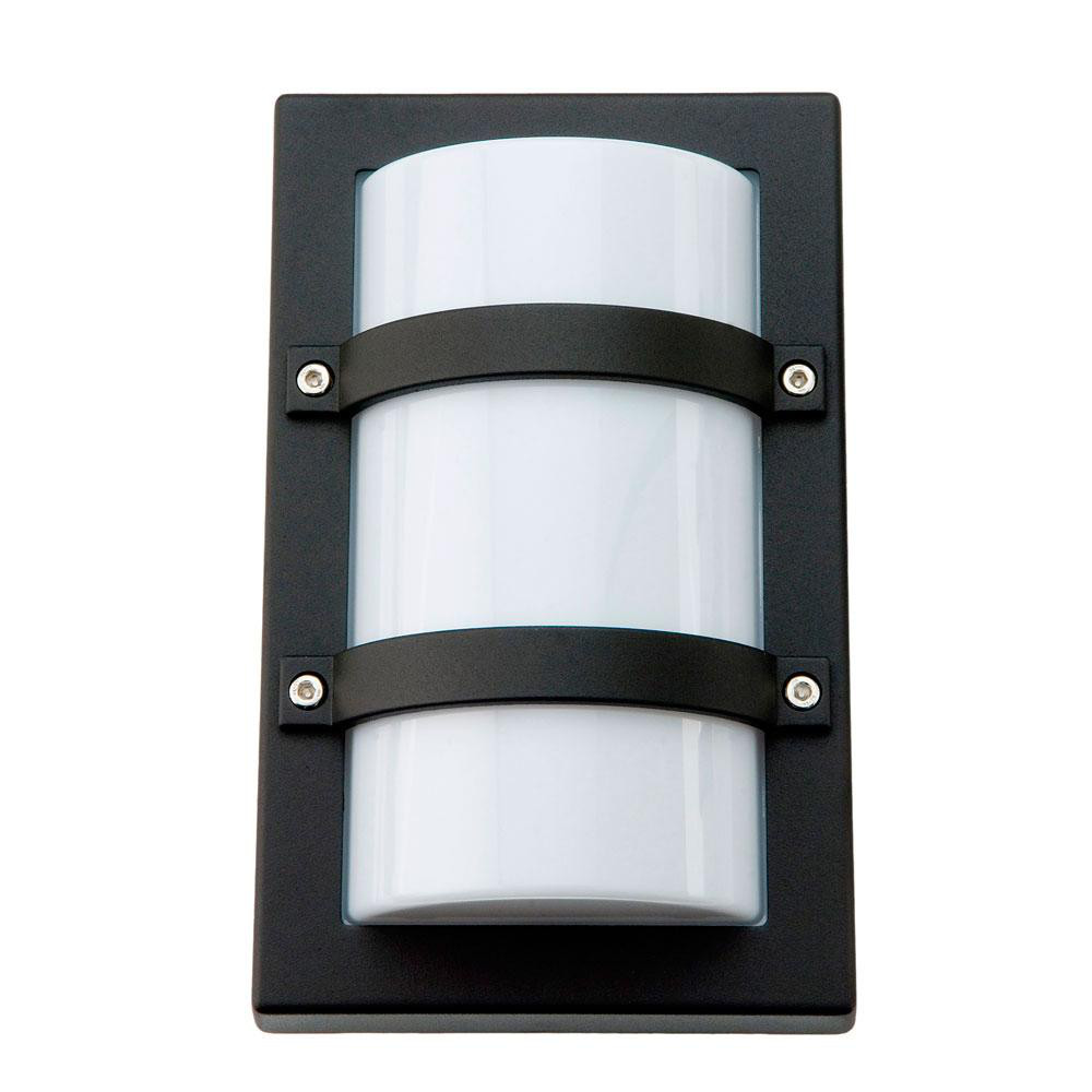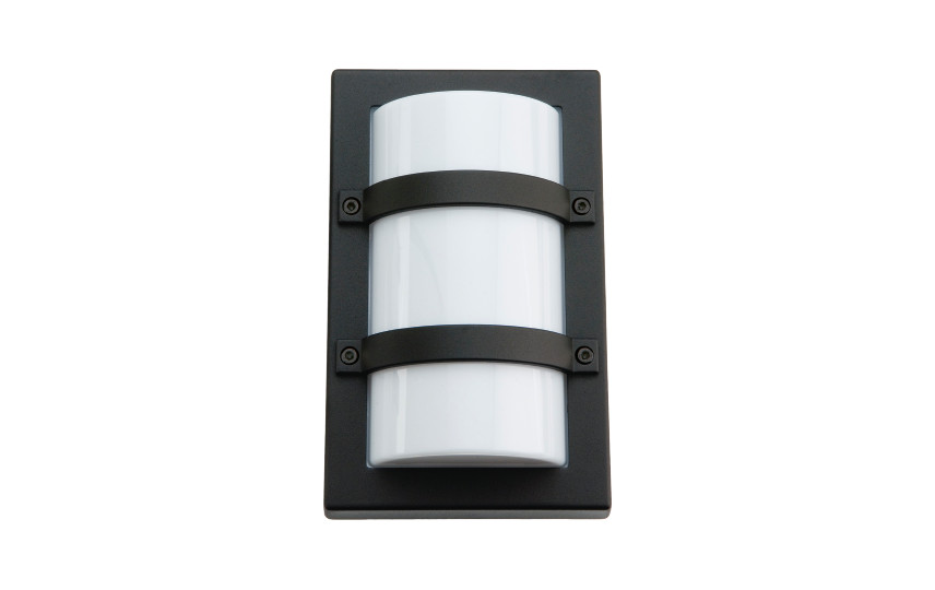 Firkantet vægarmatur i sort aluminium med opal polycarbonat skærm. 10W LED, 3000K, 400 lumen. IP65 og IK10 klassificeret.