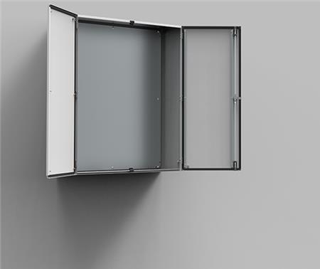 Skab med døre og monteringsplade (medfølger ikke til varenumre, der ender på PER5). Monteringsprofiler til to døre på hver dør. Kabelforskruningsplade(r) med pakning(er), 3 mm metalnøgle med to tapper og monteringstilbehør. Jordingsanordninger.