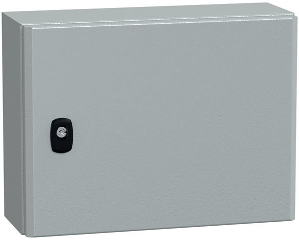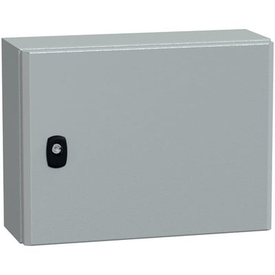Spacial S3D vægskab i stål med IP66 beskyttelse og IK10 slagstyrke. Mål: 300 x 400 x 150 mm. Farve: Grå RAL 7035.