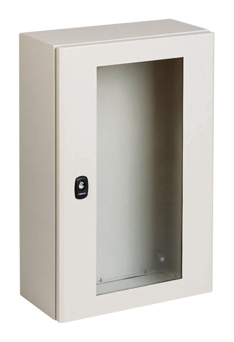 Spacial S3D vægskab i stål med rude. IP66 beskyttelse og grå RAL 7035 overflade.