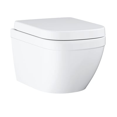 Væghængt WC-sæt med horisontalt afløb, GROHE Triple Vortex skylle-teknologi, kantløs design og skyllemængde på 3/5 l. Inkl. fikseringssæt og soft close sæde.
