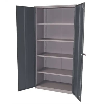 Robust, helsvejst værkstedsskab i stålplader. Ideel til opbevaring af tungt værktøj og maskiner, samt som arkiv- eller kontorskab.