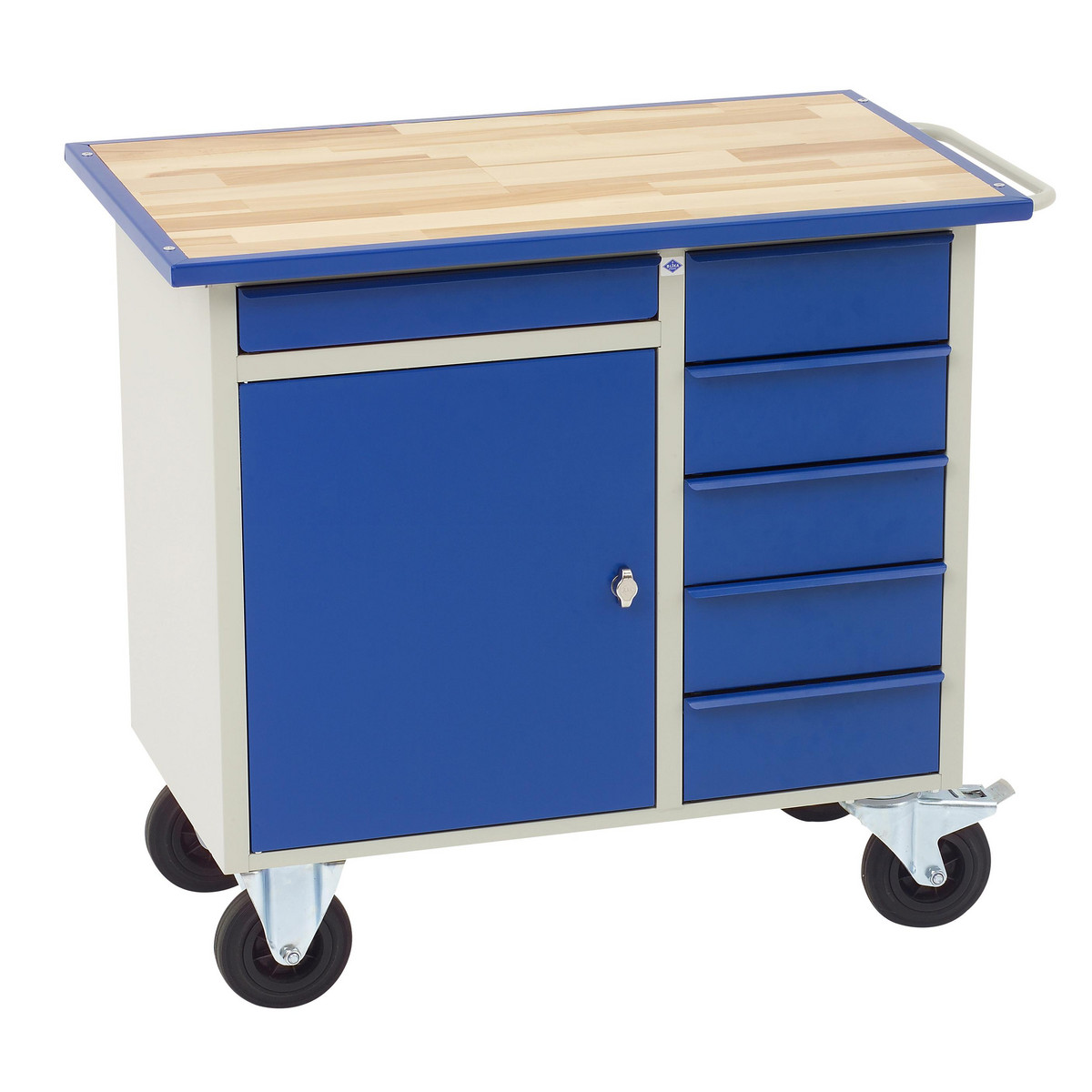 Værkstedsvogn type VV-2 med bøgeparket bordplade, stålramme og hjul (2 faste og 2 drejelige med bremse). Vognen leveres med fem smalle skuffer, en bred skuffe og en skabssektion. Alle skuffer er med stålkugleudtræk.