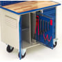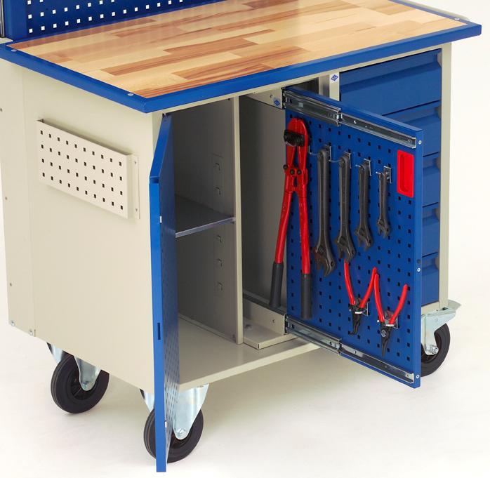 Værkstedsvogn type VV-3 med bøgeparket bordplade med stålramme og hjul (2 faste og 2 drejelige med bremse). Leveres med 5 skuffer med stålkugleudtræk og enkelt skuffespærre, skabsdør i dobbeltplade med værktøjstavle på indvendig side og 1 flytbar galvaniseret hylde, belastning 30 kg. Tegningslomme på siden, kan også bruges som værktøjstavle. Centrallås låser både skab og skuffer.