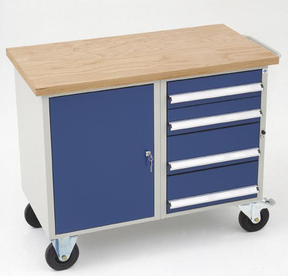 Værkstedsvogn VVM-1.1 med 4 skuffer, skab med centrallås, multiplex bordplade og kørehåndtag. Udvendige mål: H:936, B:1150/1249, D:610 mm.