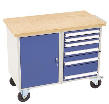 Værkstedsvogn VVM-1.2 med 6 skuffer og skab med centrallås. Udvendige mål: H:936, B:1150/1249, D:610 mm. Med multiplex bordplade og hjul.