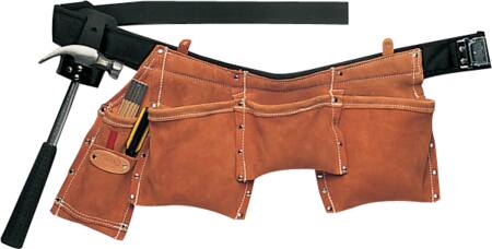 Værktøjsbælte i kraftigt brunt ruskind til montører. Med 3 lommer til søm/skruer, bred tommestoklomme og plads til andet værktøj.