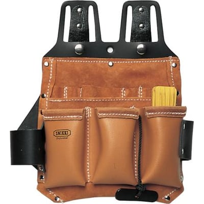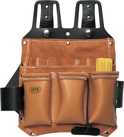 Værktøjsholder i kraftig brunt ruskind med 5 rum til skruetrækkere, kniv, tape og tommestok. Har også stort rum til tænger og afisoleringsværktøj samt hammerholder. Forstærket med Quickgrip.