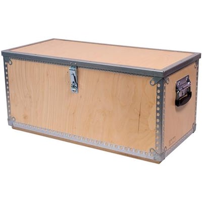 Værktøjskasse i lakeret krydsfiner med fjederhåndtag. Lukketøj til hængelås og forstærkede hjørner.