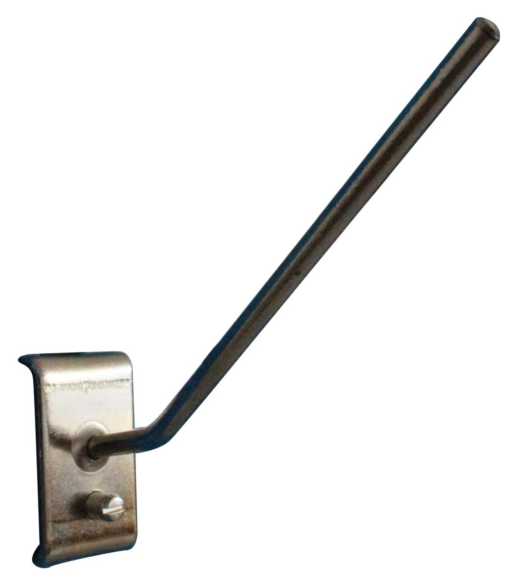 Værktøjskrog med længde 100 mm og krogdiameter Ø4 mm. Passer til hulplade med firkantede huller (9 x 9 mm) og har en center afstand på 34 mm og 38 mm.