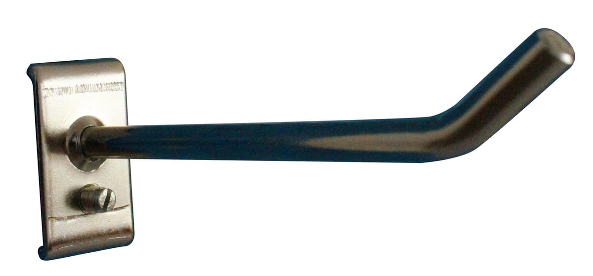 Værktøjskrog med længde 100 mm og krogdiameter Ø6 mm. Designet med enkel bagplade og passer til hulplader med firkantede huller (9 x 9 mm). Centerafstand 34 mm og 38 mm.