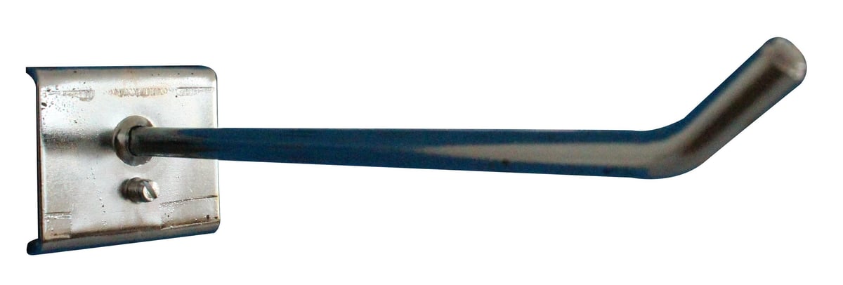 Værktøjskrog med længde 200 mm, 35 graders vinkel og Ø8 mm krogdiameter. Med dobbelt bagplade, passer til hulplade med firkantede huller (9 x 9 mm) og center afstand 34 mm og 38 mm.