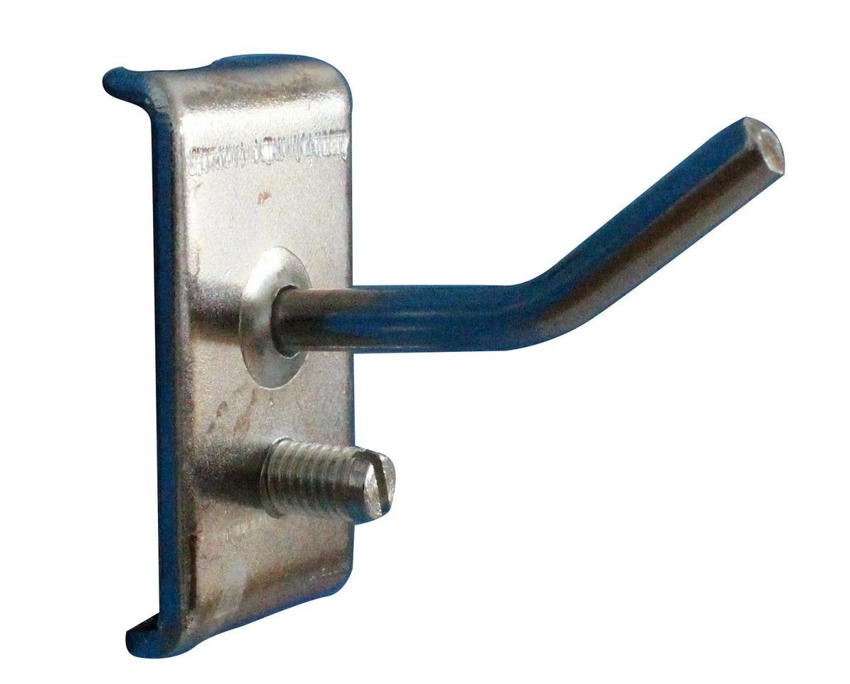 Værktøjskrog med længde 30 mm og krogdiameter Ø4 mm. Designet med enkelt bagplade og passer til hulplader med firkantede huller (9 x 9 mm). Centerafstand 34 mm og 38 mm.