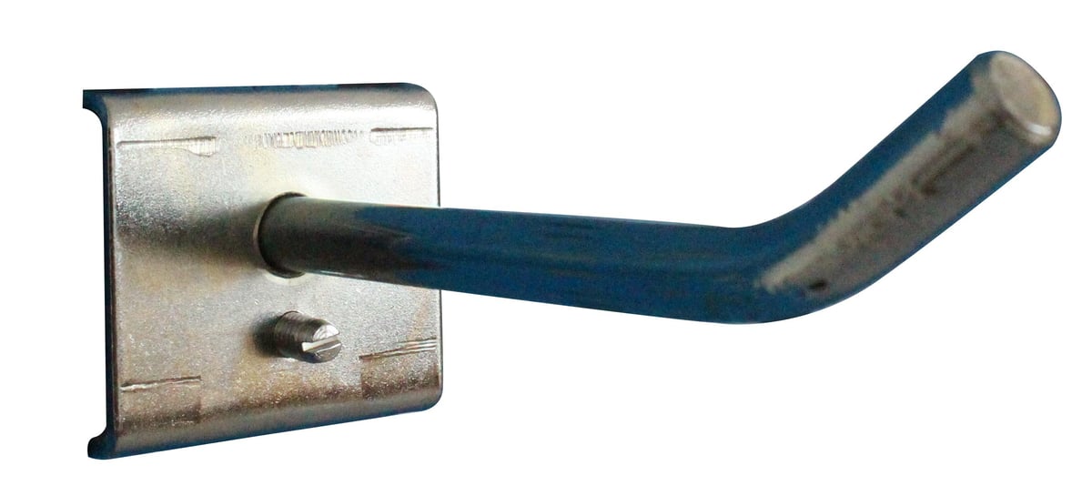 Værktøjskrog med en længde på 50 mm, 35 graders vinkel og en krogdiameter på Ø6 mm. Den har en dobbelt bagplade og passer til hulplader med firkantede huller (9 x 9 mm) med center afstande på 34 mm og 38 mm.