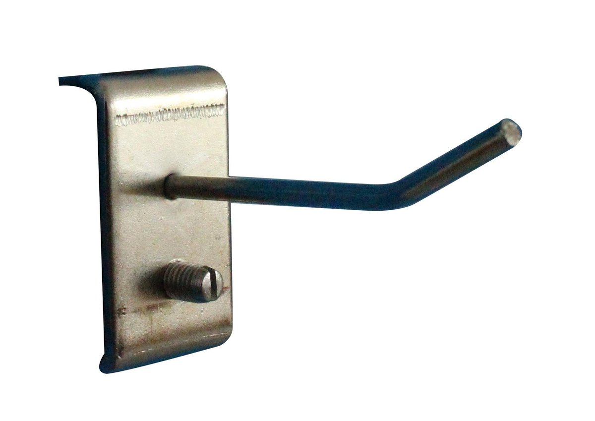 Værktøjskrog med længde 50 mm og krogdiameter Ø4 mm. Passer til hulplade med firkantede huller (9 x 9 mm) og har en center afstand på 34 mm og 38 mm.