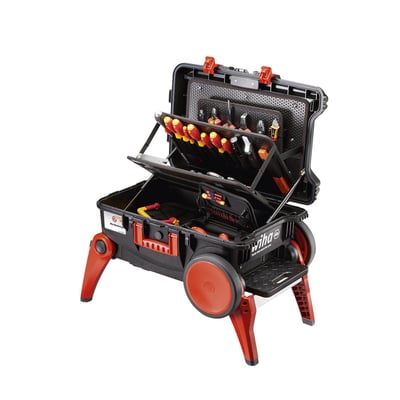 Wiha elektrikerkuffert XXL III med 100 VDE 1000V beskyttede værktøjer. Kufferten kan bruges som skammel og bærer op til 150 kg.