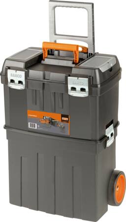 Værktøjskassen er forsynet med kraftige metal låsebeslag, et foldbart håndtag og hjul med galvaniseret aksel, hvilket gør den nem at transportere rundt.