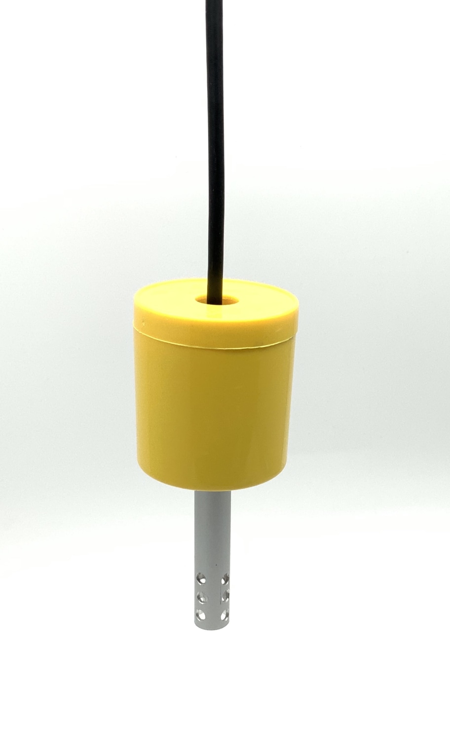 Vand sensoren er kompakt, kun 14 mm i diameter. Et gult lod (diameter 50 mm) medfølger, men kan udelades ved mindre installationer.