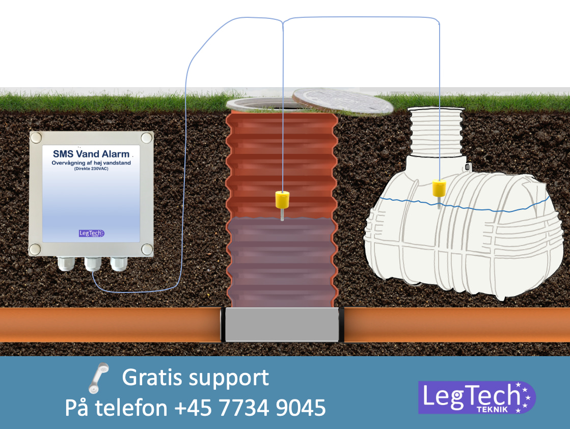 I en brønd eller septiktank monteres vand-sensoren i ledningen, ligesom en niveau-vippe. Sensoren aktiveres, når vandstanden når sensoren.