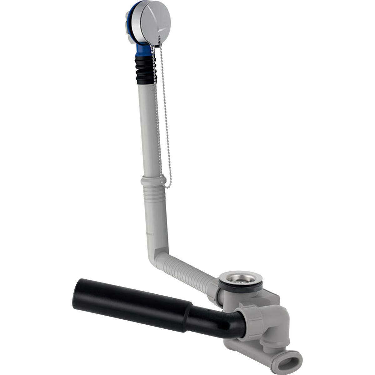 Geberit afløbsgarniture til badekar med ventilhul Ø52 mm. Afløbsydelse: 0,8 l/s. Overløbsydelse: 0,6 l/s. Vandlåshøjde: 50 mm. Inkl. slutmontagesæt, afløbsventil, afløbsbøjning, kuglekæde, vandlås og monteringsbeslag.
